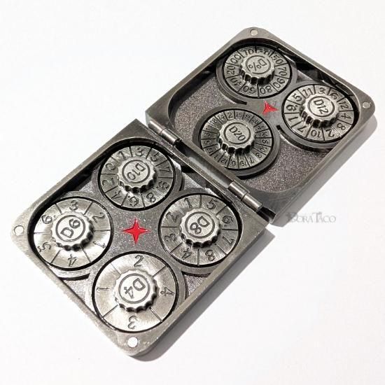 内部にD4,6,8,10,12,20,100のスピナーダイスが内蔵された「オール イン ワン」の多面体メタルサイコロ